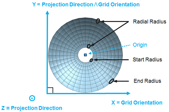 Start radius: Smallest value of the radius of curvature of the elements along the transverse axis. End radius: Highest value of the radius of curvature of the elements along the transverse axis. Radial radius: Radius of the elements along the radial axis. |