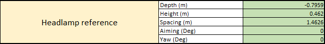 The Headlamp Reference table allows you to define the position and orientation of the whole Lighting System (i.e. both projectors) on the car from the Lighting System referential. For more details see Lighting System Position and Orientation.