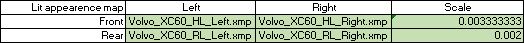 The Lit appearance map table allows you to define the lit appearance (the visualization of the lamp edges) of the front and rear lamps, which is required for Car Detection with MIL Camera.