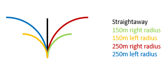 The Ansys AVxcelerate Lighting and Sensors IIHS Track is provided in the AVxcelerate IIHS Plugin package. It corresponds to the automatic driving curve and includes five trajectories which appear in the following order: straightaway, right curve (150m radius), left curve (150m radius), right curve (250m radius), and left curve (250m radius).