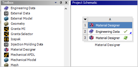 In the project schematic in Workbench, add an Engineering Data component system and link the Material Designer cell to the Engineering Data cell.