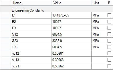 Young's Modulus X 232 GPa Young's Modulus Y 15 GPa Young's Modulus Z 15 GPa Poisson's Ratio XY 0.279 Poisson's Ratio YZ 0.49 Poisson's Ratio XZ 0.279 Shear Modulus XY 24 GPa Shear Modulus YZ 5.033577 GPa Shear Modulus XZ 24 GPa