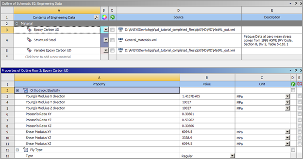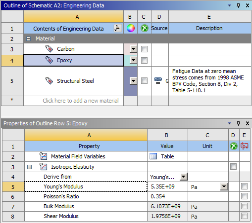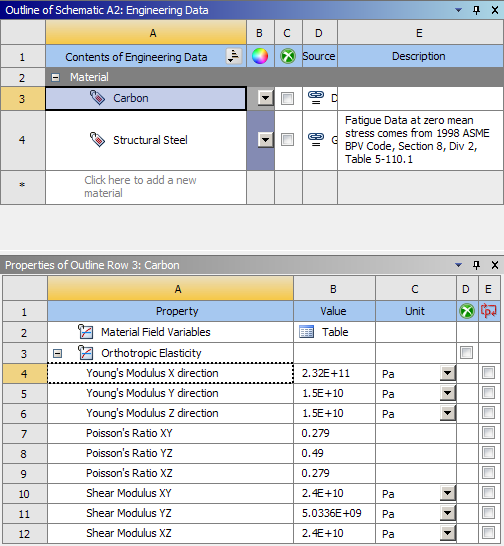 Double-click the Engineering Data cell of the downstream component system and review the materials in the Engineering Data screen. The computed materials are available and can be used in further analysis steps like any other material.