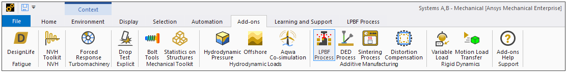 An AM process simulation can be run using native Mechanical interface objects and working through the project tree. For an easier approach, however, we recommend you load the LPBF Process Add-on, accessible from the Add-ons Tab in the Mechanical ribbon. Simply click the LPBF Process button (in the Additive Manufacturing group) to load the add-on. The button is shaded blue when the add-on is loaded.