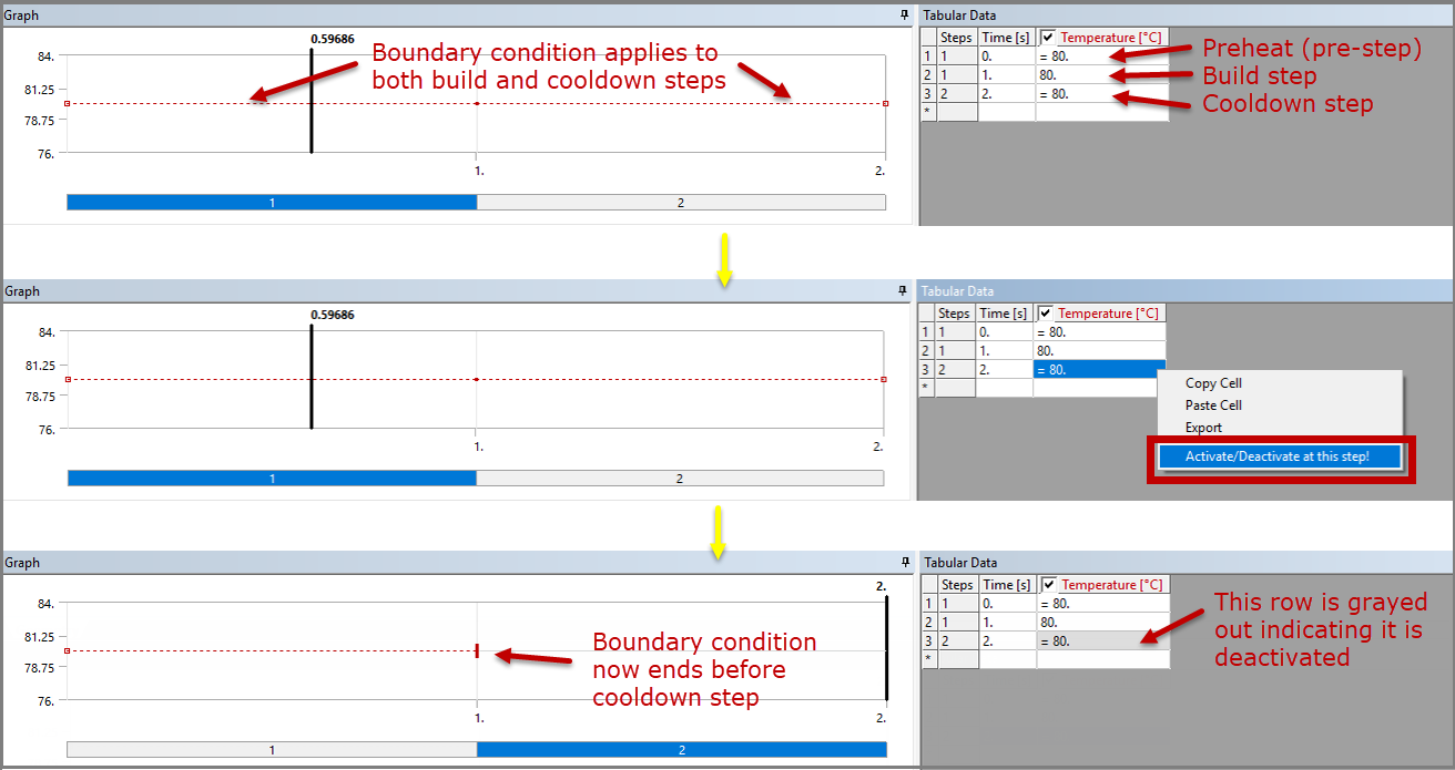 In the Tabular Data area of the interface, notice the temperature value you just entered is applied for all sequence steps. (The first row of tabular data is considered T=0, the preheat condition.) In the printing process, since the heat is removed after the part is printed, you'll need to remove the temperature boundary condition for the cooldown step of the simulation. Right-click in the third row and click Activate/Deactivate at this step! which will deactivate (remove) the elevated temperature for the cooldown step.