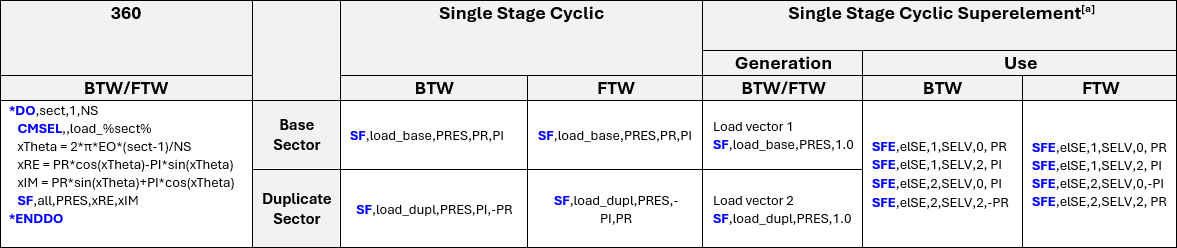 You can apply harmonic backward traveling wave (BTW) and forward traveling wave (FTW) loads directly to your model. The following summary table describes the procedure depending on if your model is a 360 (full non cyclic) model, a single stage cyclic model, or a single stage cyclic superelement model[a].