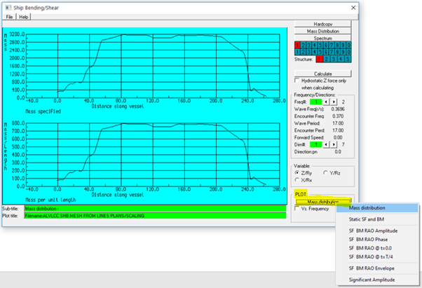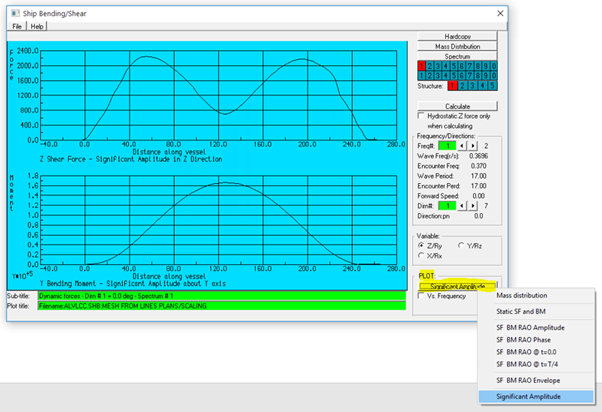 If a wave spectrum has been defined in the imported .RES file, or defined in Wave/wind Spectra from the AGS Edit menu – Environment – Spectra, the significant amplitudes of shear force and bending moment along a specified ship direction can be calculated and plotted.