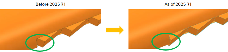 Therefore, as of version 2025R1, new default meshing parameters values are applied upon creation of the following features, in order to provide a more relevant and simplified default meshing than prior versions.