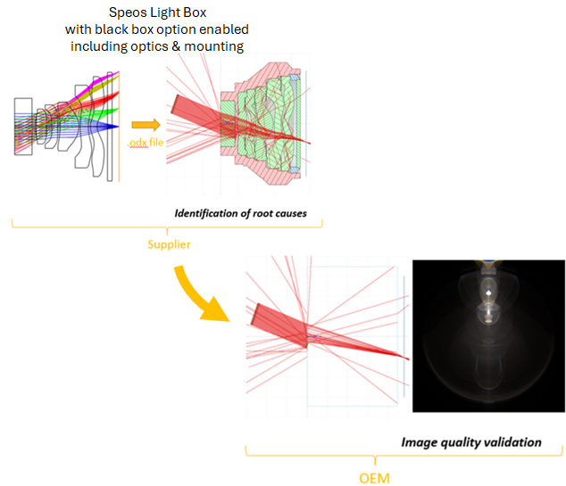 Ray tracing does not expose the impacts happening inside the Speos Light Box, without changing the optical path.