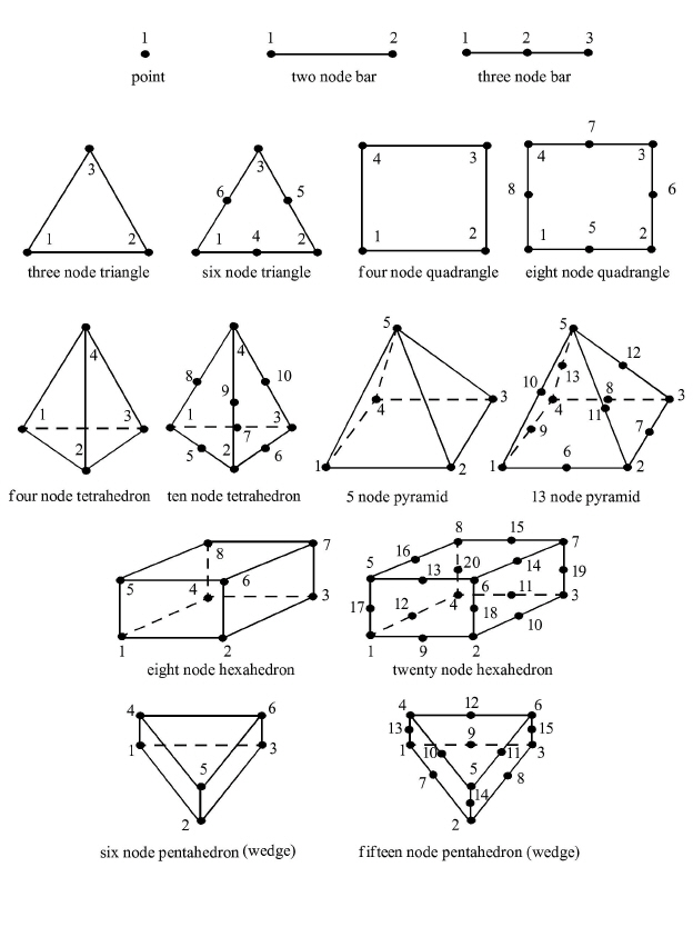 The EnSight5 format supports a defined element set as shown below. The data must be defined in this element set. Elements that do not conform to this set must either be subdivided or discarded.