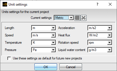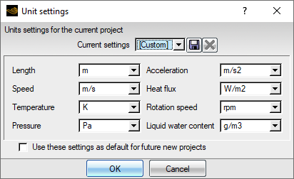 The unit system applies to all runs within the same project directory. You can select either the Metric or Imperial system for which all units are pre-defined. The unit of each physical variable can also be set manually using the Custom option and saved by clicking the disk icon.