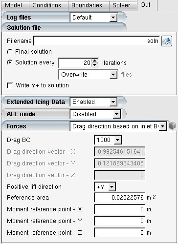 20and Maximum number of time steps to300.Select the Out panel. Save the droplet and crystal solution files, in FENSAP format, and choose to Overwrite files every