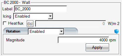 Click BC_2000 to set the wall boundary conditions for the spinner. This wall surface is at the front of the geometry and an angular velocity is assigned to it. Set the Temperature value to