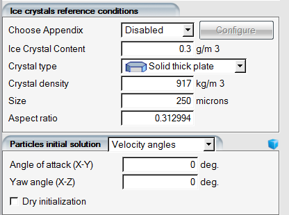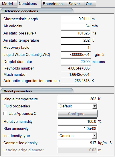 For this tutorial, the default values of free stream LWC (1 g/m3) and MVD (20 microns) are retained. Do not modify the reference and boundary conditions that have been automatically assigned by the drag & drop operation.
