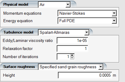 Go to the Model section. Select the Navier-Stokes option in the Momentum equations box (viscous flow) and the Full PDE in the Energy equation box. Select the Spalart-Allmaras option in the Turbulence model box. Set the value of the Eddy/Laminar viscosity ratio to