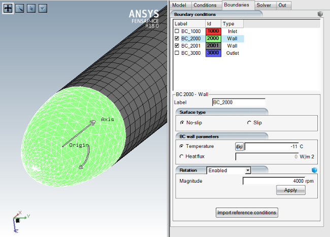 The axis of rotation is automatically detected by FENSAP-ICE, and displayed in the viewer port on the left. In the Rotation box, select the Enabled option and assign a rotation rate of
