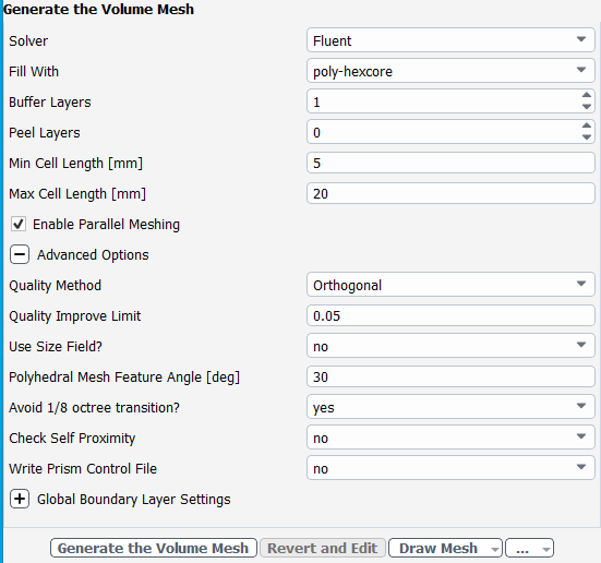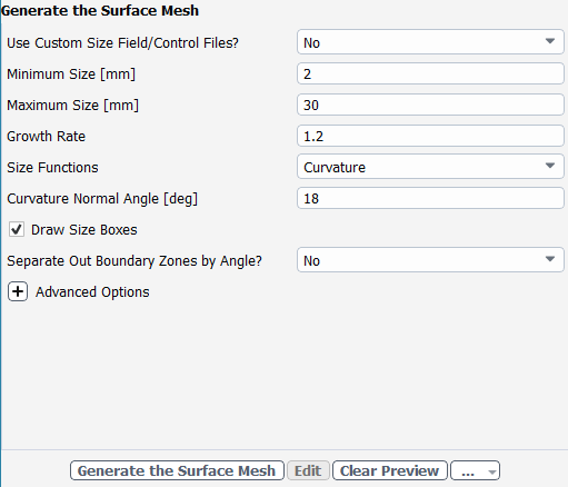 Expand the Advanced Options task, to set properties of the volume mesh.