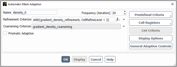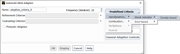 Select Aerodynamics... / Shock Indicator / Density-based from the Predefined Criteria drop-down list in the Automatic Mesh Adaption dialog box.