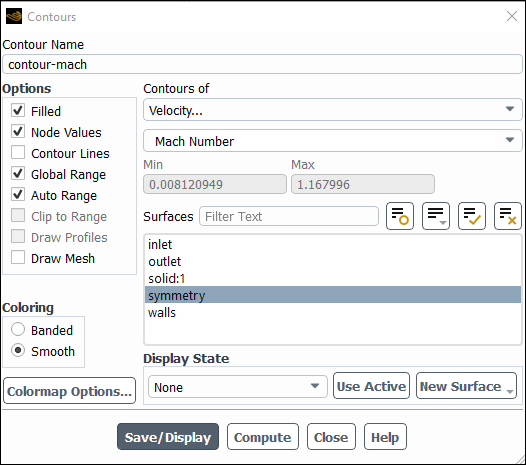 contour-machfor Contour Name.Select Velocity... and Mach Number from the Contours of list.