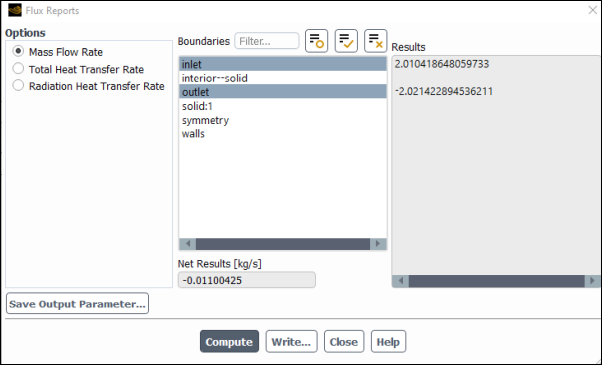 Important: The net mass imbalance should be a small fraction (for example, 0.1%) of the total flux through the system. The imbalance is displayed in the lower right field under Net Results. If a significant imbalance occurs, you should decrease your residual tolerances by at least an order of magnitude and continue iterating.