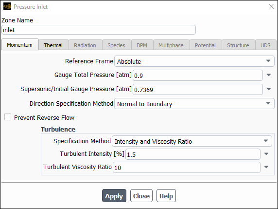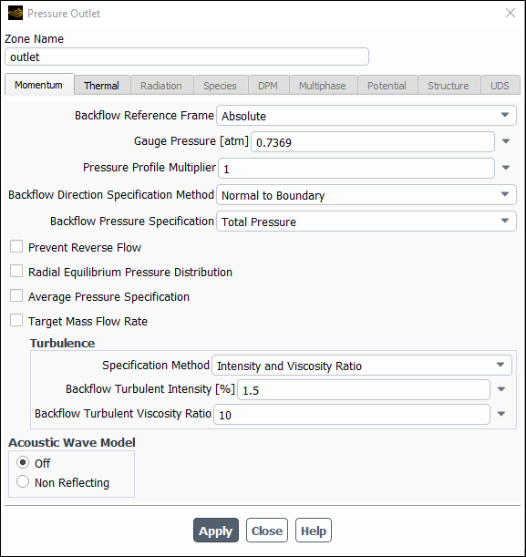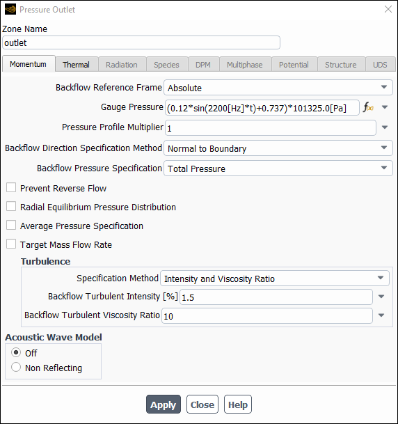 (0.12*sin(2200[Hz]*t)+0.737)*101325.0[Pa]Click and close the Pressure Outlet dialog box.