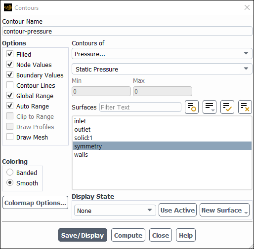 contour-pressurefor Contour Name.Select Pressure... and Static Pressure from the Contours of list.