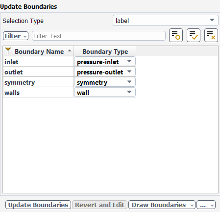 Select the Update Boundaries task, where you can inspect the mesh boundaries and confirm and change any designated boundaries accordingly. Ansys Fluent attempts to determine the correct arrangement of boundaries automatically.