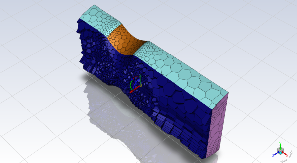 Ansys Fluent will apply your settings and proceed to generate a volume mesh for the geometry.. The mesh is displayed in the graphics window and a clipping plane is automatically inserted with a layer of cells drawn so that you can quickly see the details of the volume mesh.