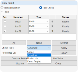 Use this task panel to select an iteration and tool to check the geometry for shape, curvature, undercuts, and element angles.
