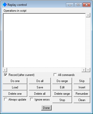Note:The replay function allows you to record the steps necessary to complete the mesh. The Replay Control window may be moved aside or minimized while recording, but the window should be kept active until recording is complete.