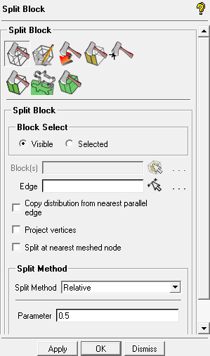 (Select edge(s)) and select the edge defined by vertices 11 and 19 or by vertices 13 and 21.Position the new edge as shown in Figure 4: Initial Vertical Split and click the middle-mouse button to accept the position.