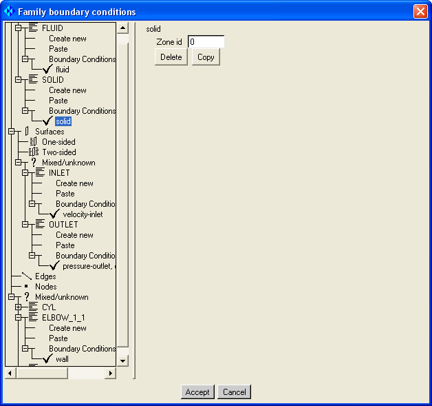 Set the boundary conditions for FLUID to fluid and SOLID to solid.