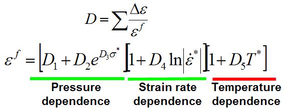This model is constructed in a similar way to the Johnson-Cook plasticity model in that it consists of three independent terms that define the dynamic fracture strain as a function of pressure, strain rate and temperature: