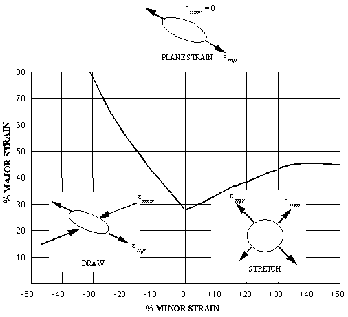 This material model is used for simulating the sheet metal forming of anisotropic materials. Only transversely anisotropic materials can be considered. For this model, the dependence of the flow stress with the effective plastic strain is modeled by defining a yield stress and a tangent modulus. In addition, you also define a forming limit diagram. This diagram will be used to compute the maximum strain ratio that the material can experience.