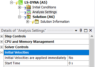 Set Initial Velocities are applied immediately to No in the Initial Velocities section of the Analysis Settings object.