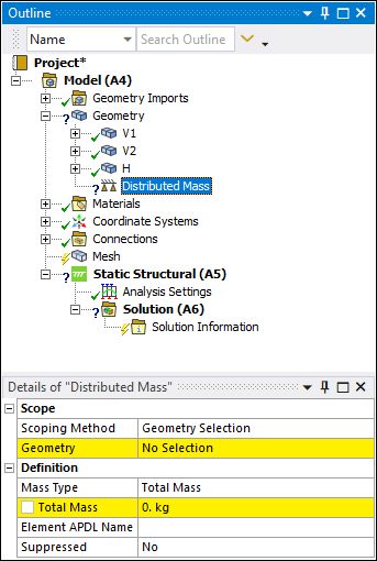 Scoping Method: Specify as (default) or . Geometry: Displayed when the Scoping Method is set to (default). Displays the type of geometry (Face or Edge only) and the number of faces to which the Distributed Mass has been applied using the selection tools. Use the Face or Edge selection filter to pick geometry, click in the field, then click . Named Selection: Displays when the Scoping Method is set to . This field provides a drop-down list of available face- or edge-based user-defined Named Selections. |
