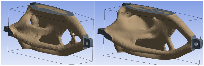 This illustration displays 238,000 tetrahedrons on the left and 950,000 on the right. The feature on the left is very thin (one element size) and reaches the limit of the Level Set capability to properly capture the design. The finer mesh on the right provides an improved design.