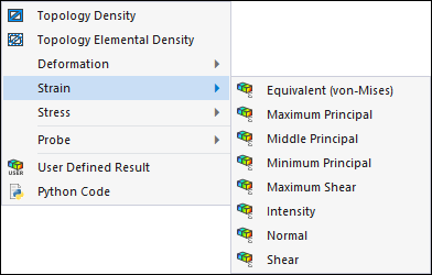 The Structural Optimization analysis supports certain structural results, including Deformation, Stress, and Strain, etc.