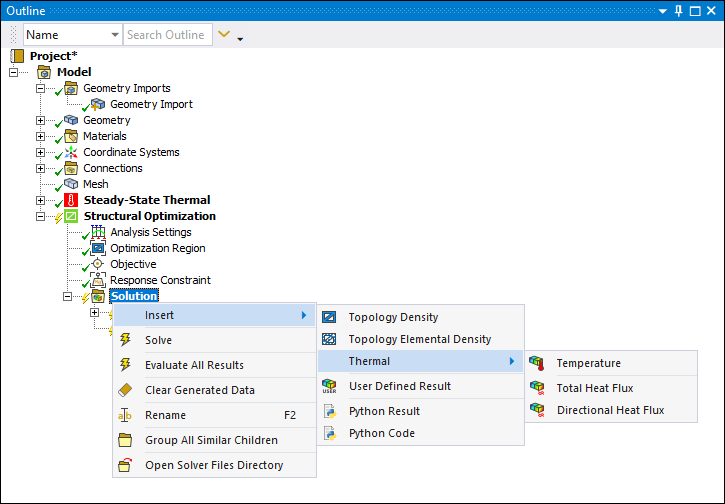 The Structural Optimization analysis supports certain thermal results, including Temperature, Directional Heat Flux, and Total Heat Flux.