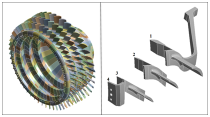 The Compressor Model to be analyzed consists of three blade rows and a rim that can be simplified as a multistage system with four axially aligned cyclic stages merged at three interstage boundaries as shown in the figure below. The model is fixed along the rim. It has a rotational speed, and the blades are subjected to pressure and temperature variations along the stages due to air compression. Multistage cyclic symmetry analysis is used to determine the deformation of the structure due to the imposed load and to determine the natural frequencies of the structure. For this, a static, modal and pre-stressed modal analysis will be performed.