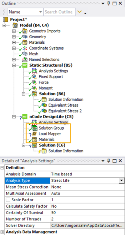 Set the Analysis Type to . The main objects required for a DesignLife analysis are then generated automatically. These are the Solution Group, Load Mapper and Materials objects.