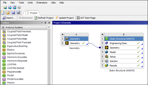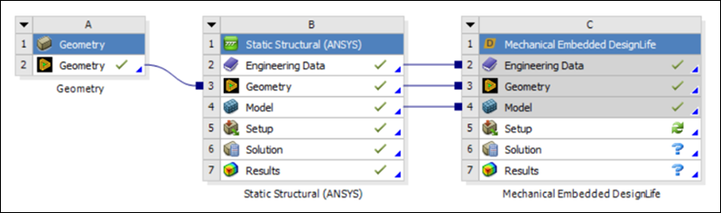 If you return to the Project schematic in Workbench, the system is also visible connected to the Static Structural system. The Mechanical Embedded DesignLife system is incorporated into the schematic, sharing Engineering Data, Geometry and Model cells with the Mechanical system.