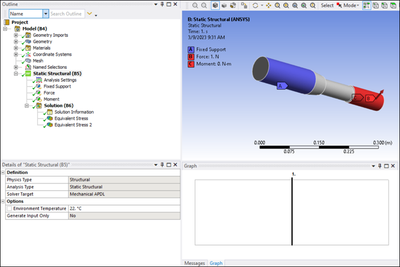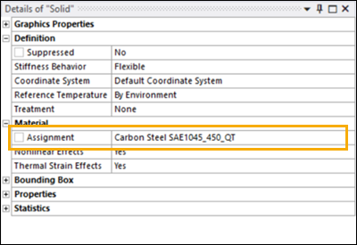 Expand the geometry list, select the Solid part, and verify in the Details window for Solid that the Material Assignment is