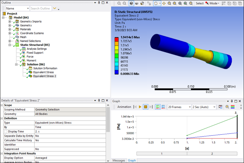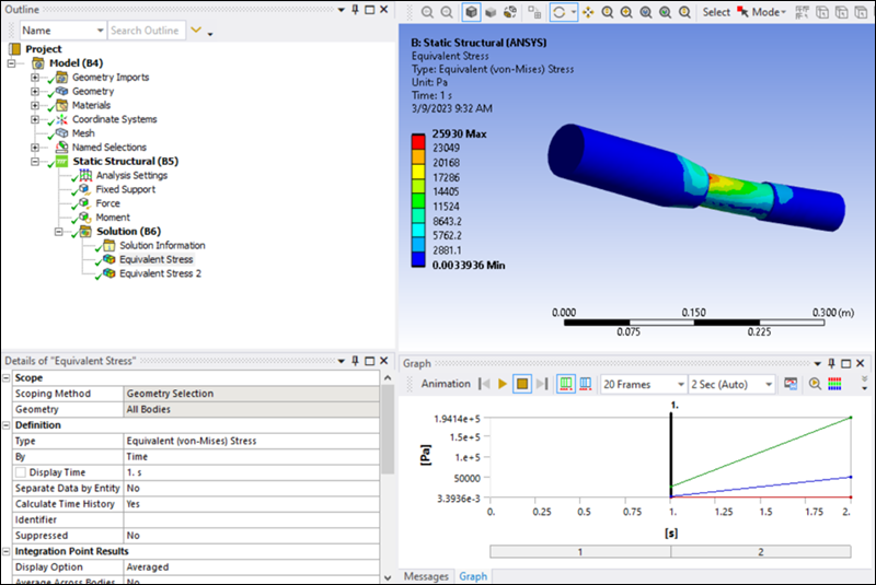 In this tutorial, you will perform a fatigue analysis of a simple shaft under combined bending and torsion using the Mechanical DesignLife Add-on. The example uses linear stresses from two load steps in a Mechanical simulation, and combines them with two measured non-proportional load histories.