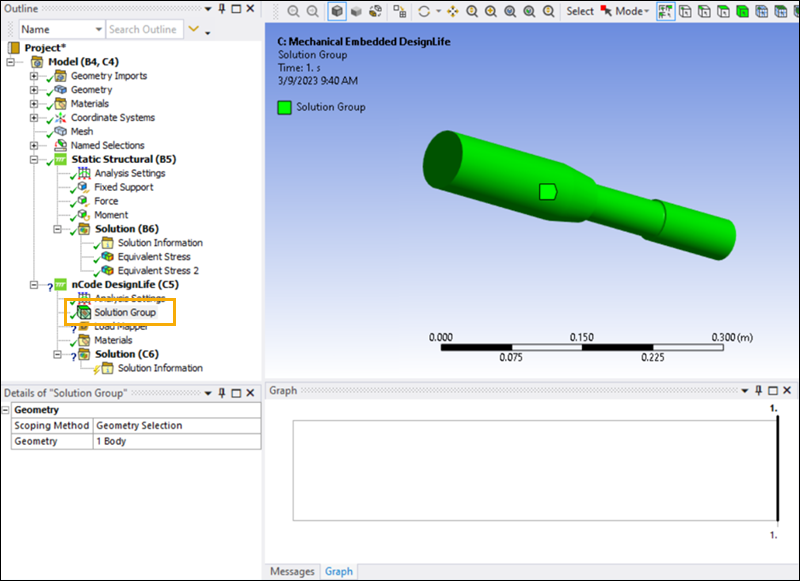 The Solution Group defines the portion of the geometry that will be calculated for the fatigue analysis. By default, all bodies are selected. In this case, there is only one geometry, so there is no need to modify the setting.