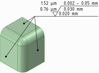 You can insert surface finish symbols onto your design, drawing sheet, or 3D markup slide. Surface finish symbols move along with the surface they are attached to.