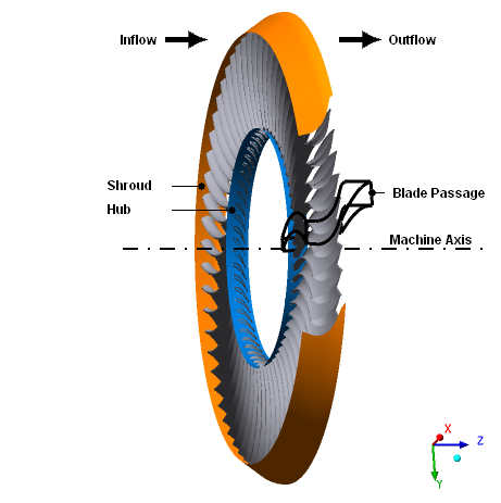 The stator contains 60 blades distributed about the Z axis. A clearance gap exists between the blades and the shroud, with a width of 2% of the total span. Within the blade passage, the maximum diameter of the shroud is approximately 97.5 cm.