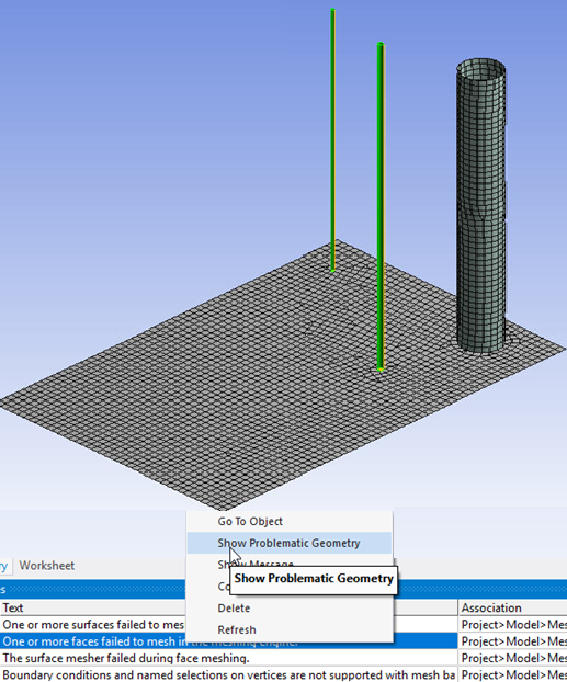 When an error or warning such as unconnected edges or mesh failure occurs, you can right-click the corresponding message and select Show Problematic Geometry to highlight the location at which error occurred in the model.
