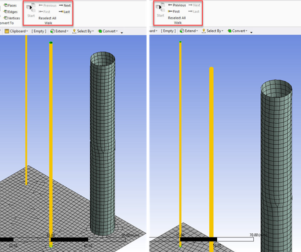 You can view the unconnected faces after meshing. To view the unconnected faces, right-click the Geometry window. Select Diagnostics > Find Unconnected Faces. The unconnected faces get highlighted in the model.