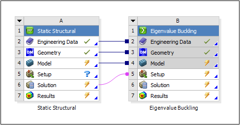 From the Toolbox, drag a Static Structural template to the Project Schematic. Then, drag an Eigenvalue Buckling template directly onto the Solution cell of the Static Structural template. The proper linking is illustrated below.